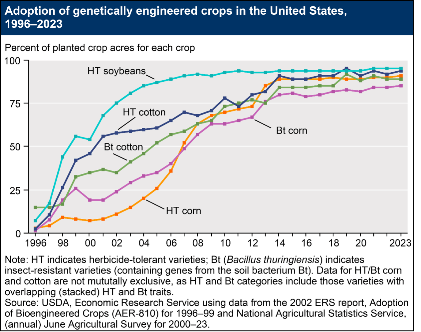 Big developments have increased yields over the years in a number of ways. The potential from today’s seed varieties is much greater than 3 or 4 decades ago. Varieties are now bred with herbicide and insect tolerance along with better plant health. The adoption of genetically engineered crops as shown in the graphic below has been a major factor in yield improvements.